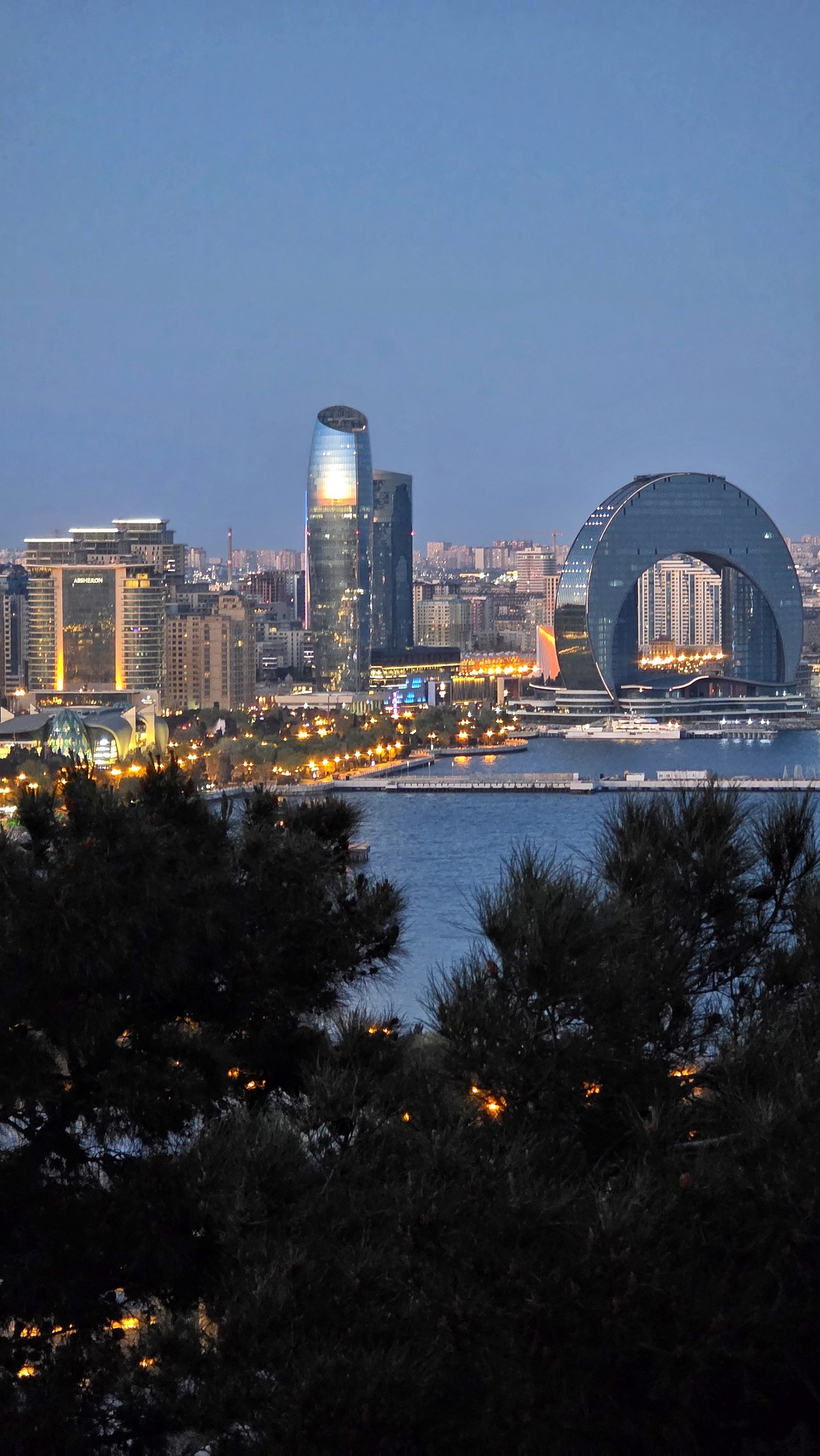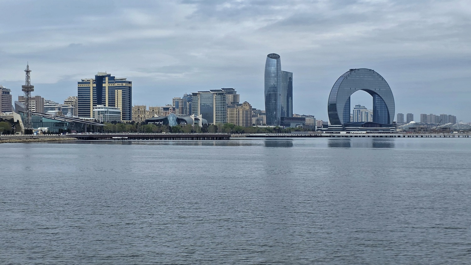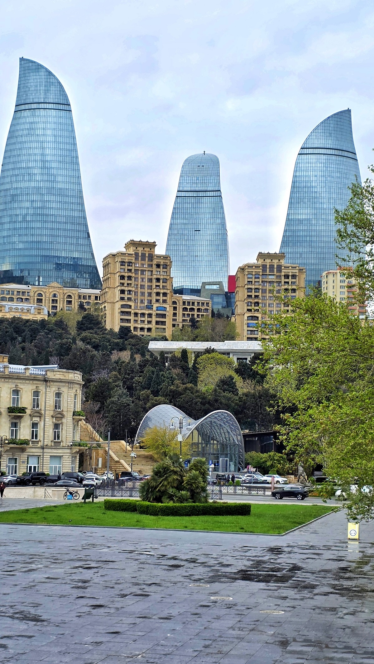Między kolejnymi punktami łapałyśmy widoki na Flame Towers – nawet przy pochmurnym niebie robią wrażenie i są świetnym kontrastem dla historycznej części miasta.