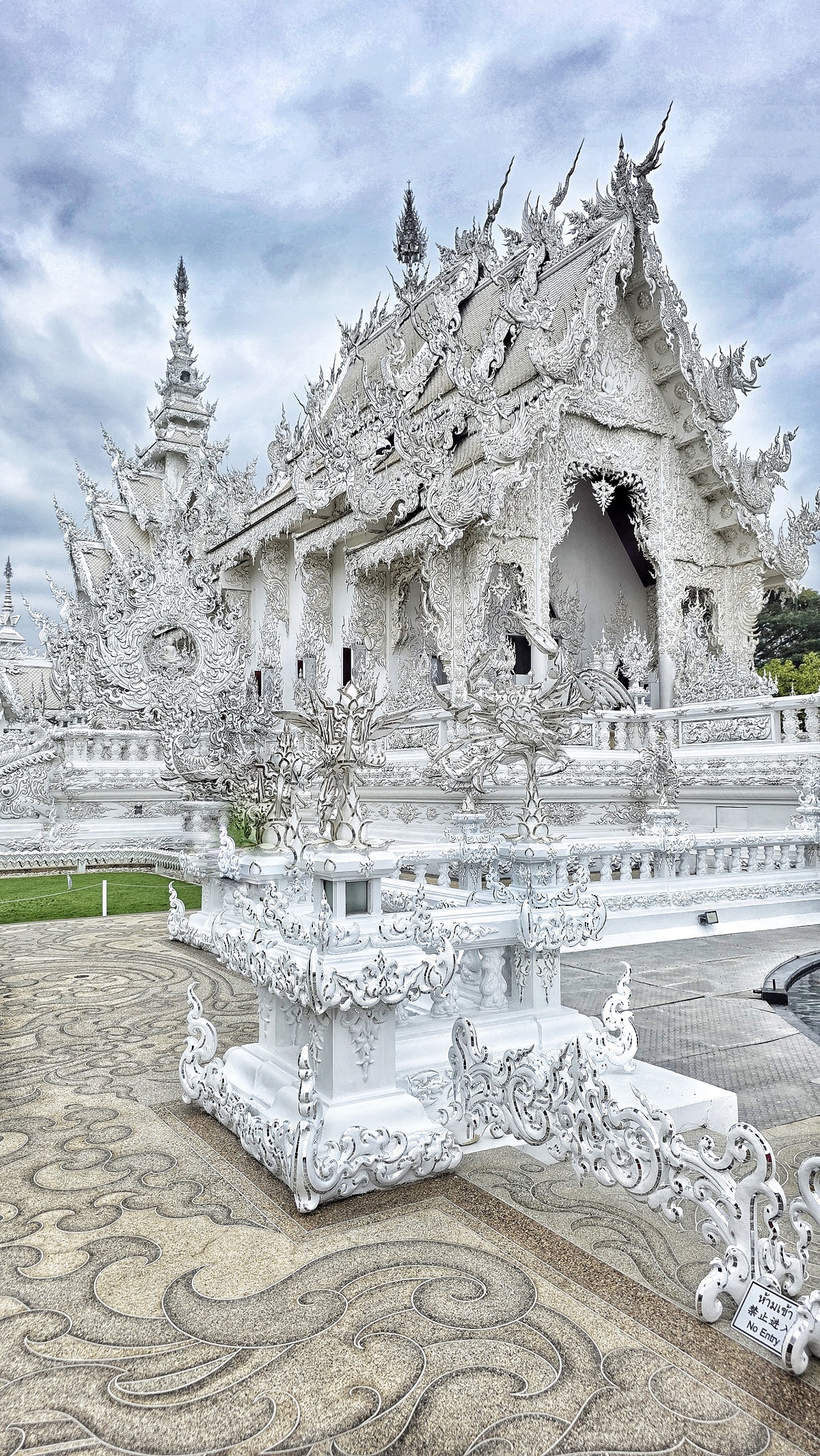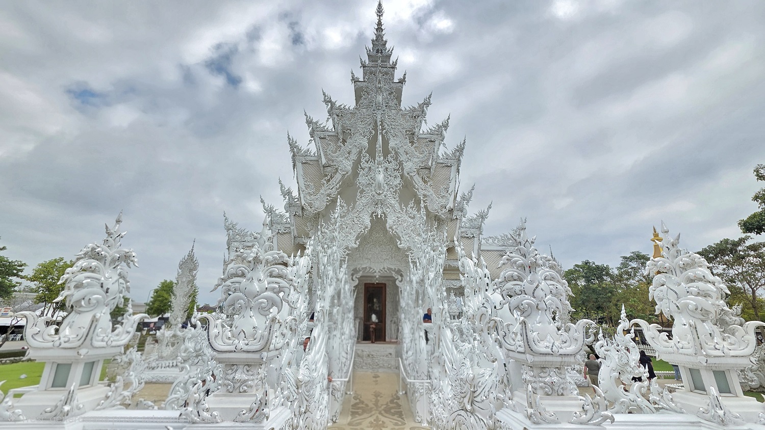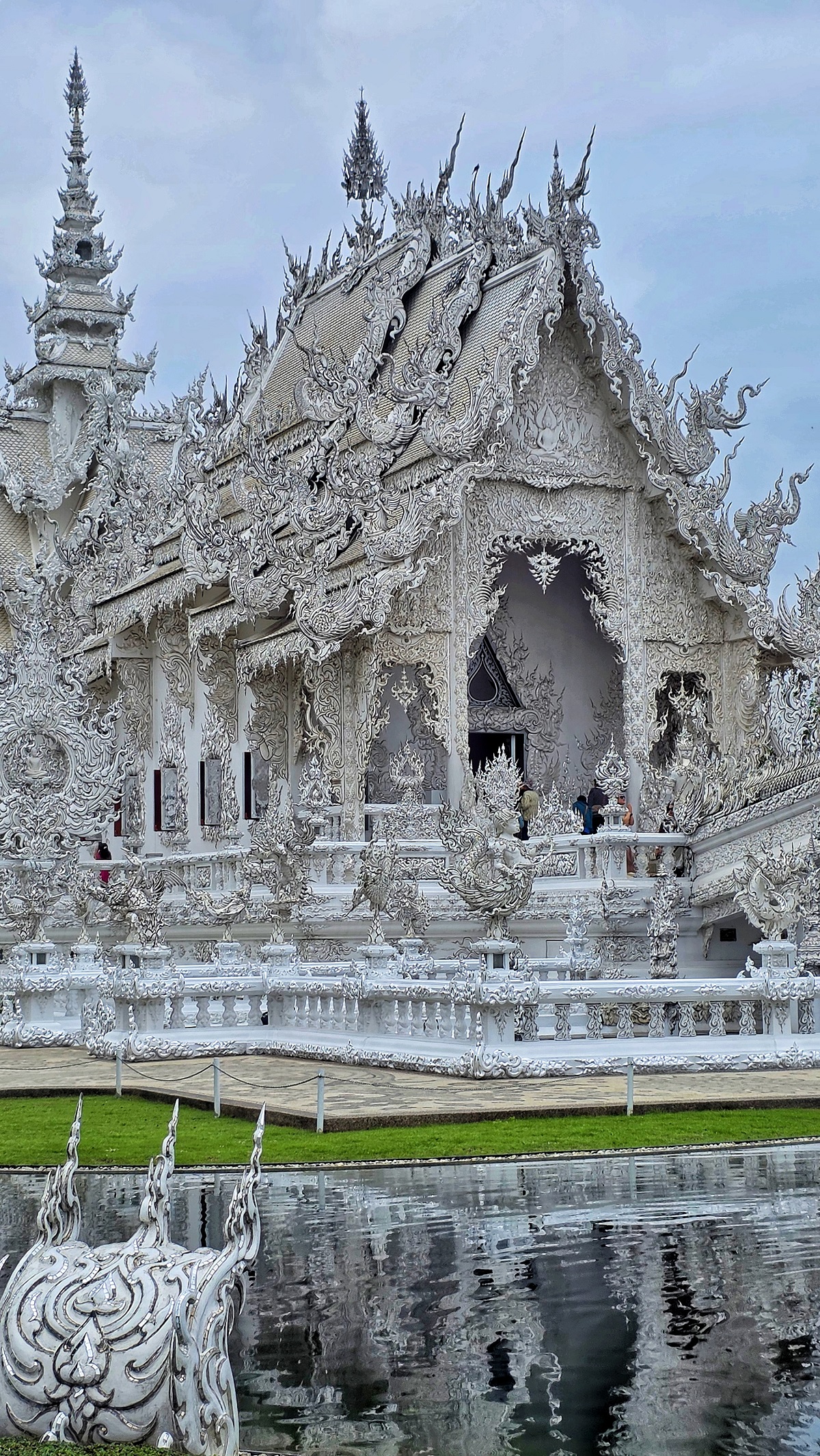 Kiedy w końcu dotarliśmy na miejsce i zbliżaliśmy się do Białej Świątyni w Chiang Rai, pierwsze, co przyciągnęło naszą uwagę, to jej niesamowita biel. Nawet mimo chmur świątynia dosłownie „świeciła” – delikatnie odbijała światło i wyglądała trochę jak z innego świata. Na zdjęciach niestety tego nie widać, ale w realu naprawdę biel bije po oczach.