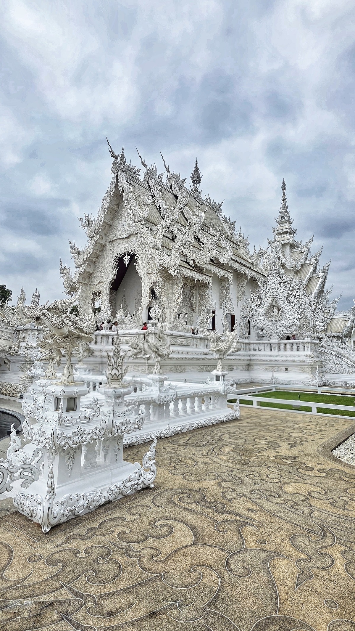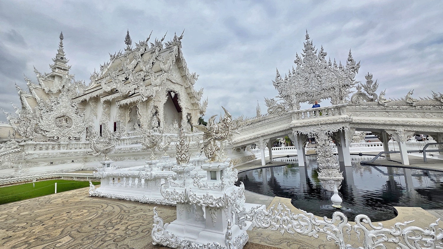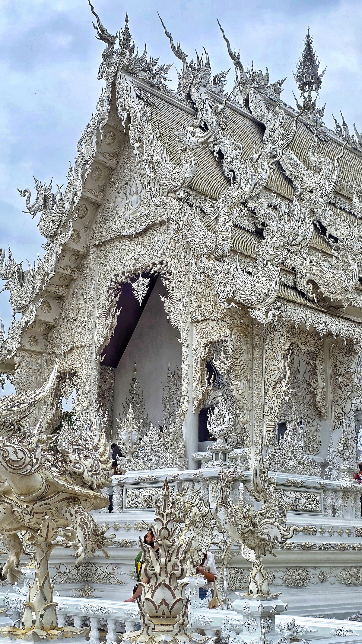 Kiedy w końcu dotarliśmy na miejsce i zbliżaliśmy się do Białej Świątyni w Chiang Rai, pierwsze, co przyciągnęło naszą uwagę, to jej niesamowita biel. Nawet mimo chmur świątynia dosłownie „świeciła” – delikatnie odbijała światło i wyglądała trochę jak z innego świata. Na zdjęciach niestety tego nie widać, ale w realu naprawdę biel bije po oczach.