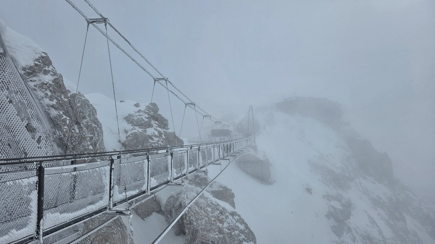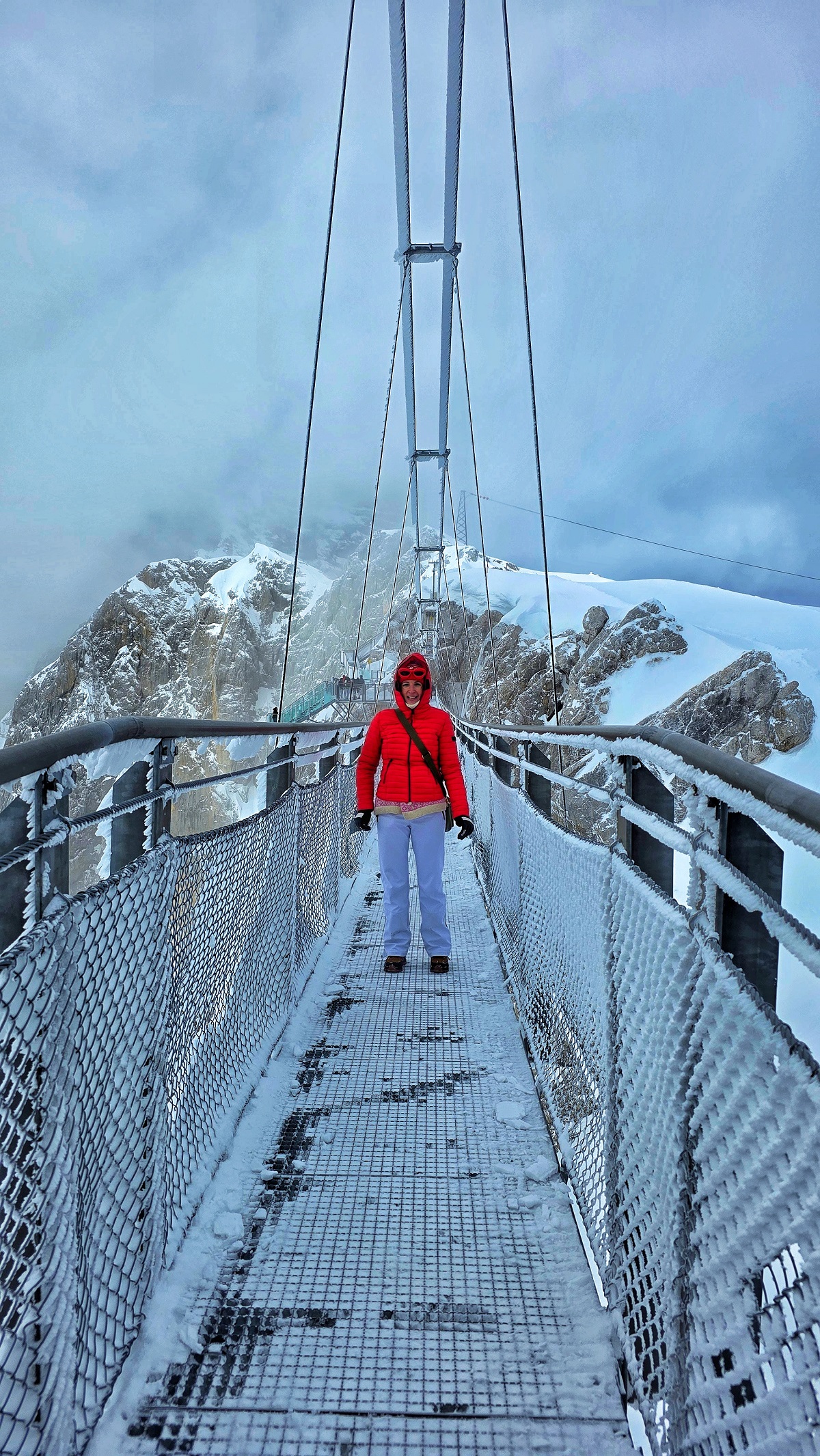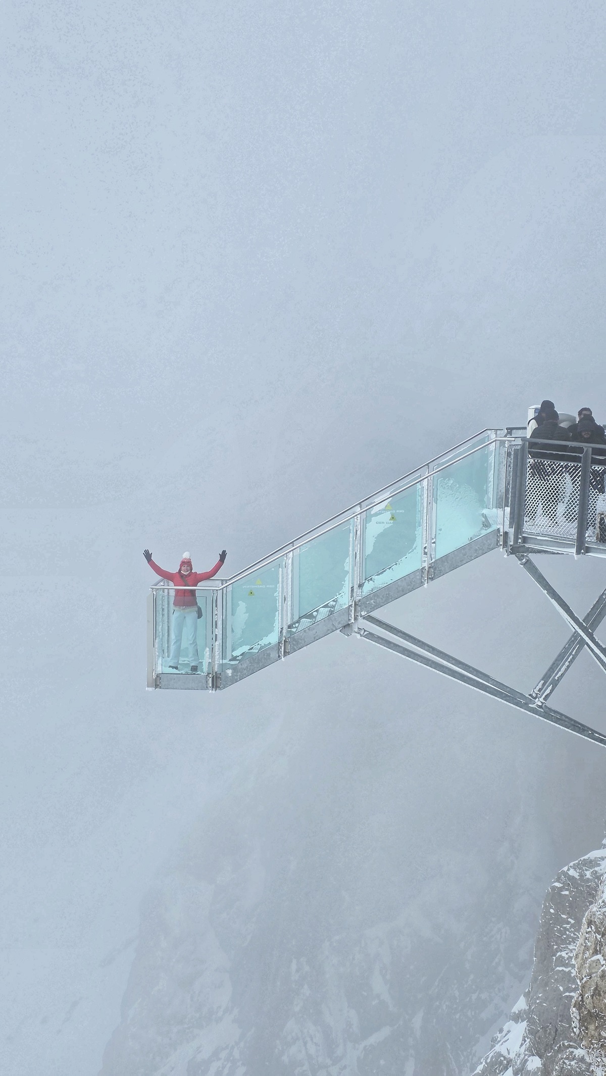 Każdy krok był małą decyzją. Na dole – szklana podłoga i przestrzeń, która powinna zapierać dech w piersiach. I zapierała. Przez… może pięć sekund. Tyle trwało nasze szczęśliwe okienko pogodowe. Chmury rozsunęły się, odsłaniając monumentalne alpejskie krajobrazy. I zanim zdążyłam w pełni nacieszyć oczy – znów wszystko zniknęło.