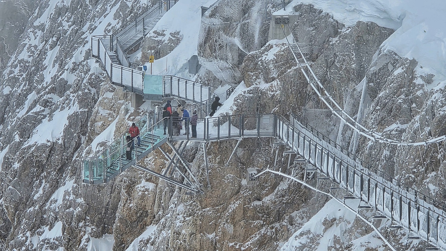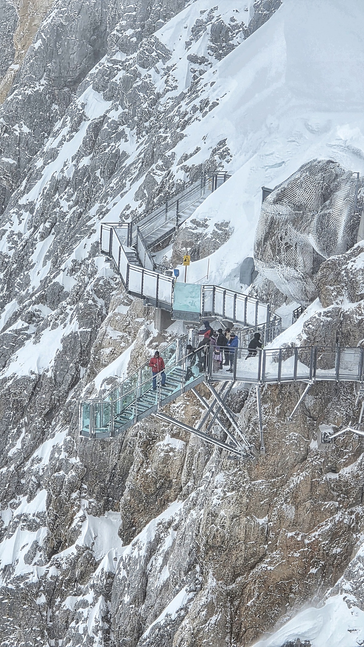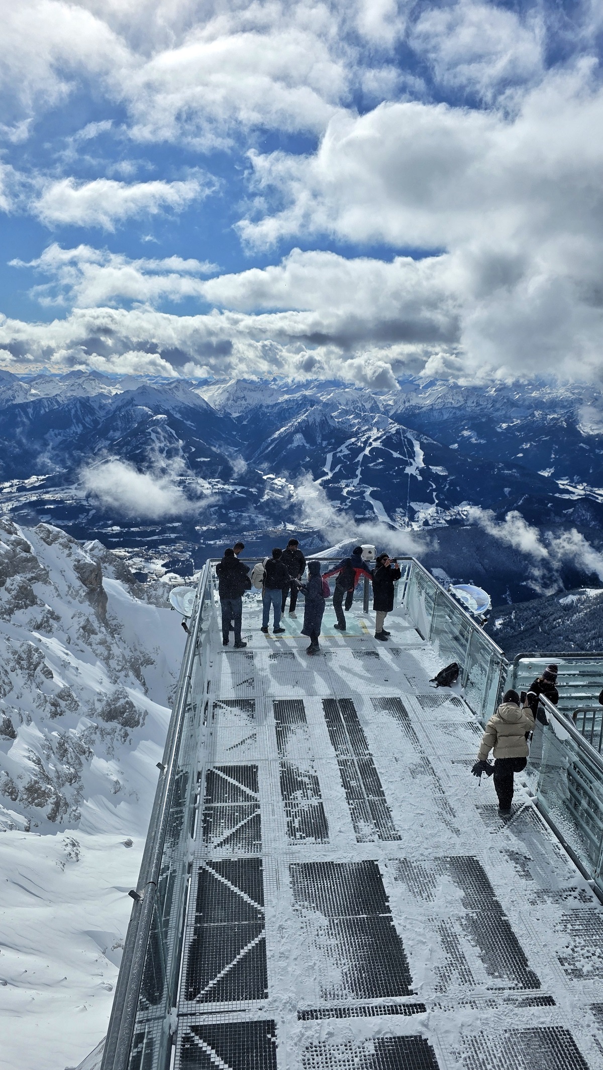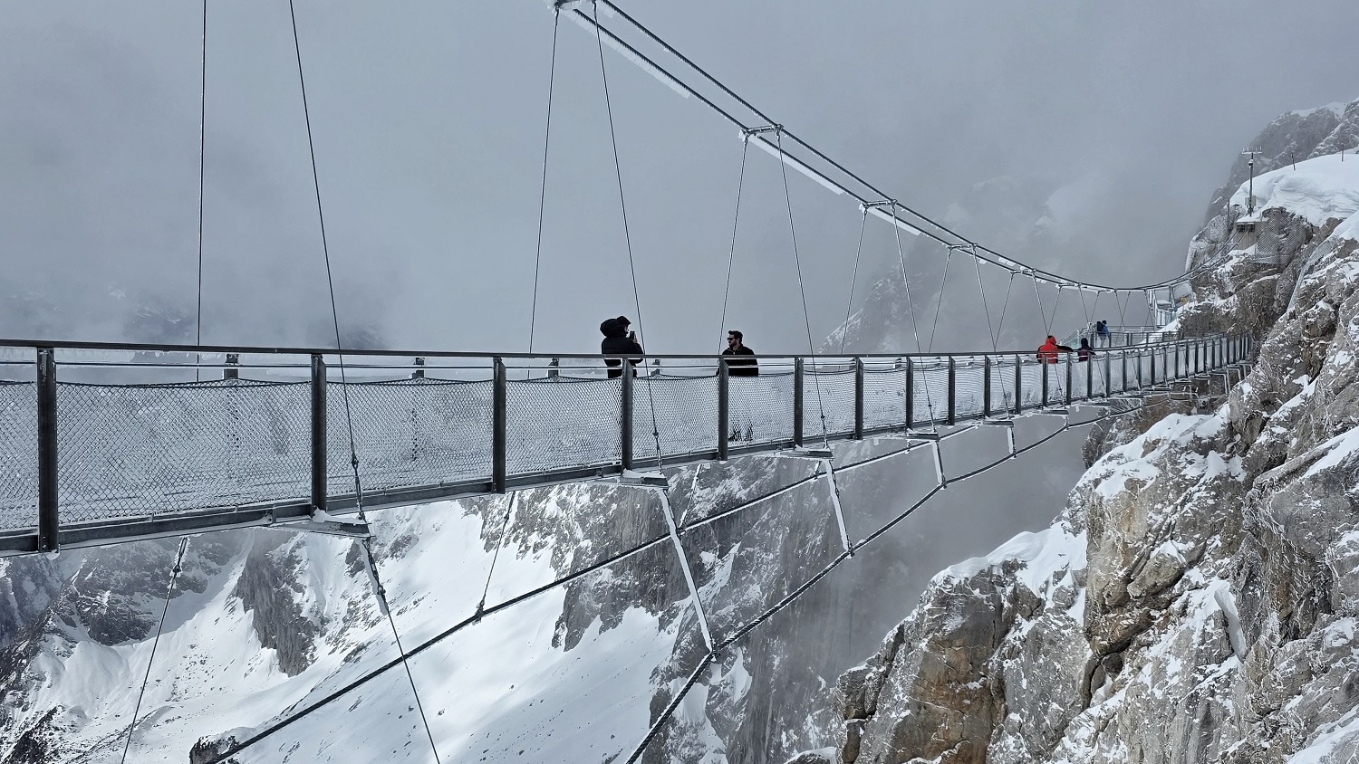Każdy krok był małą decyzją. Na dole – szklana podłoga i przestrzeń, która powinna zapierać dech w piersiach. I zapierała. Przez… może pięć sekund. Tyle trwało nasze szczęśliwe okienko pogodowe. Chmury rozsunęły się, odsłaniając monumentalne alpejskie krajobrazy. I zanim zdążyłam w pełni nacieszyć oczy – znów wszystko zniknęło.