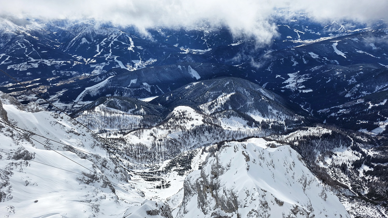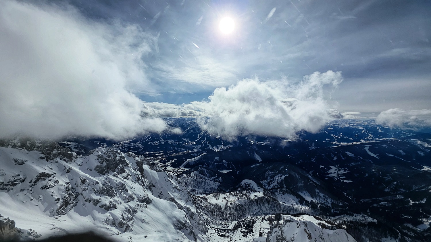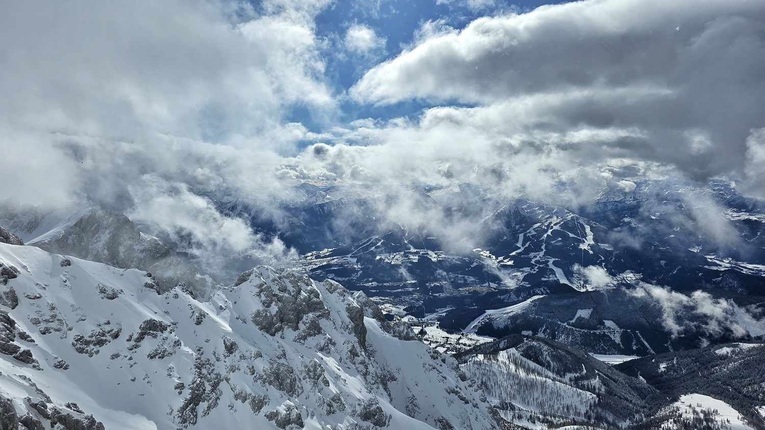 Widok podczas wjazdu na Dachstein to prawdziwy spektakl natury. Góry, doliny i śnieżne połacie rozciągają się aż po horyzont. Czuję lekki zawrót głowy, gdy wszystko pode mną oddala się coraz bardziej, a ja zbliżam się do nieba. Po około 10 minutach docieramy do stacji górskiej. Twardy grunt pod nogami daje ulgę, ale… natura ma swoje plany.