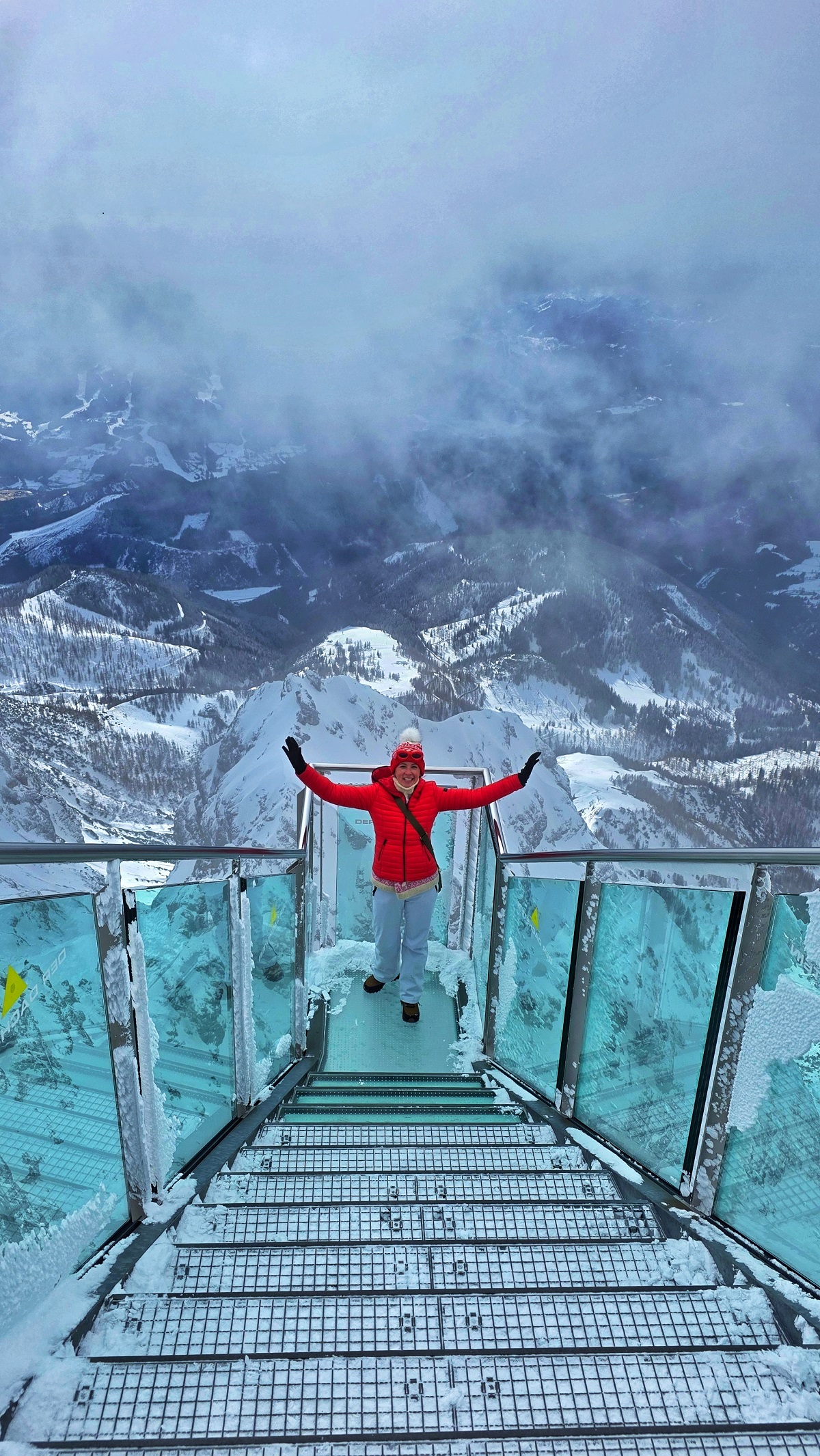 Gdy stanęłam na krawędzi platformy, świat nagle zrobił się ogromny. Pod nami potężny masyw Dachsteinu, ostre granie, śnieżne pola i przestrzeń, która zdawała się nie mieć końca. Szczyty wyglądały, jakby były na wyciągnięcie ręki.