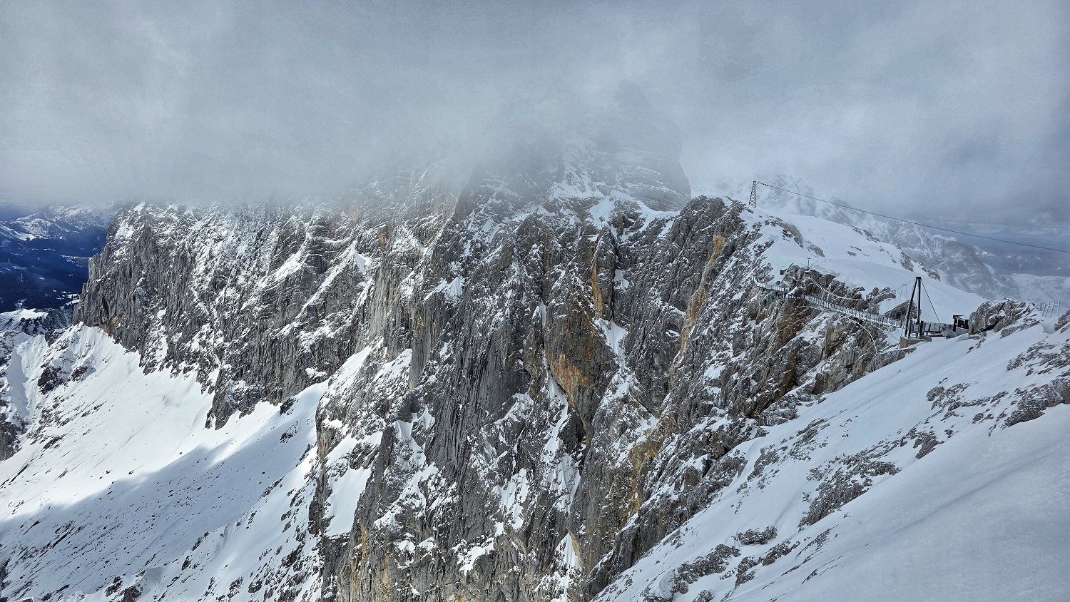 Choć na dole było bezchmurne niebo, na górze czekała nas niespodzianka. Gęste chmury pojawiły się niemal znikąd i zaczęły zasłaniać panoramiczne widoki, z których słynie lodowiec Dachstein.