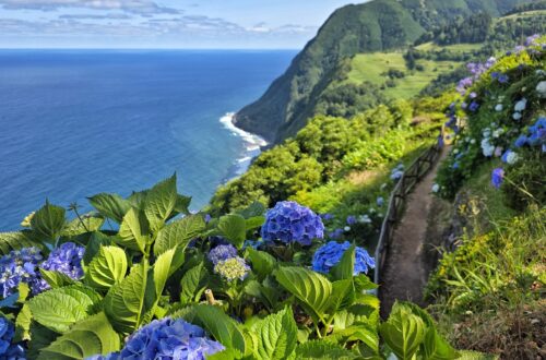 Ta część wyspy jest mniej znana wśród turystów, ale właśnie dlatego tak urzeka – dzika, zielona, nieco tajemnicza. Zamiast gęstych pól hortensji znajdziecie tu soczystą zieleń wzgórz, strome klify i lasy pełne paproci. W okolicy znajdują się malownicze plaże, punkt widokowy Miradouro do Ponta da Madrugada, urocze latarnie morskie i wiele tras spacerowych prowadzących do ukrytych jezior i wodospadów.